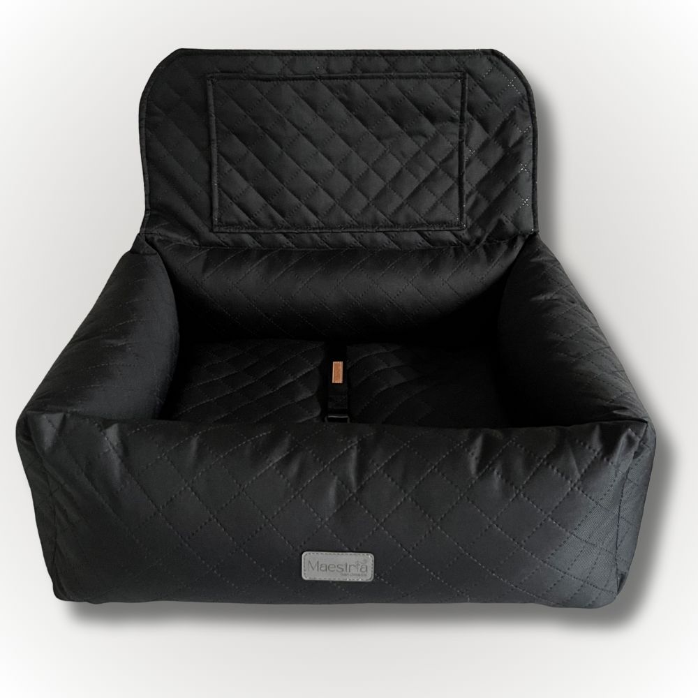 Fotelik wykonany jest z wysokiej jakości wodoodpornej tkaniny z certyfikatem OEKO-TEX, dzięki czemu skutecznie chroni tapicerkę auta przed zabrudzeniami i wilgocią. Wewnątrz znajduje się dwustronna poduszka. Jedna strona to miękki, przyjemny w dotyku welur, idealny na chłodniejsze dni. Druga strona to tkanina wodoodporna, doskonała po spacerach lub w cieplejsze dni. Fotelik posiada kieszeń, która pozwala wygodnie przechowywać smycz, wodę i wiele innych produktów.