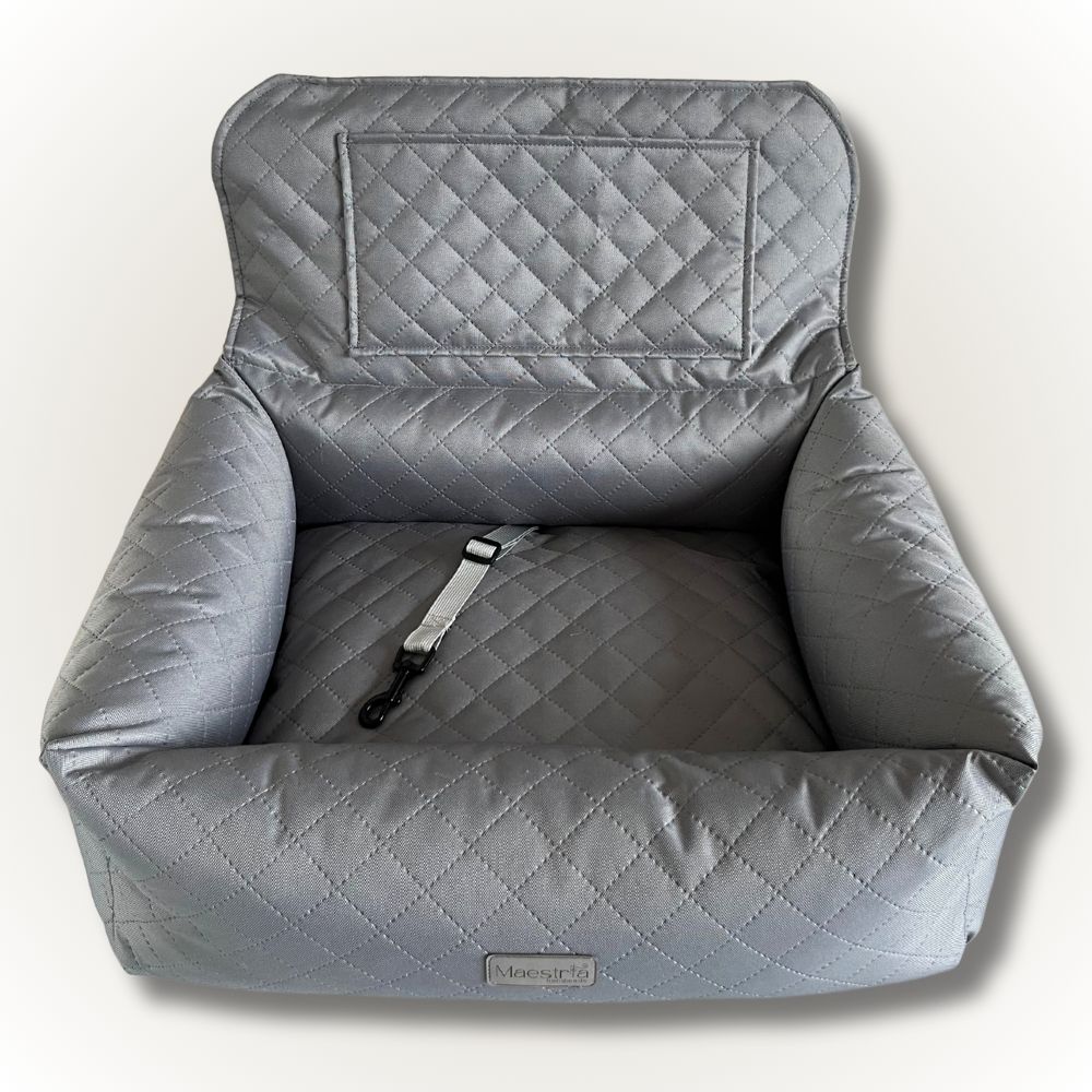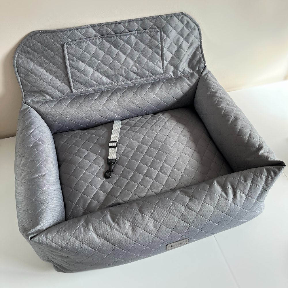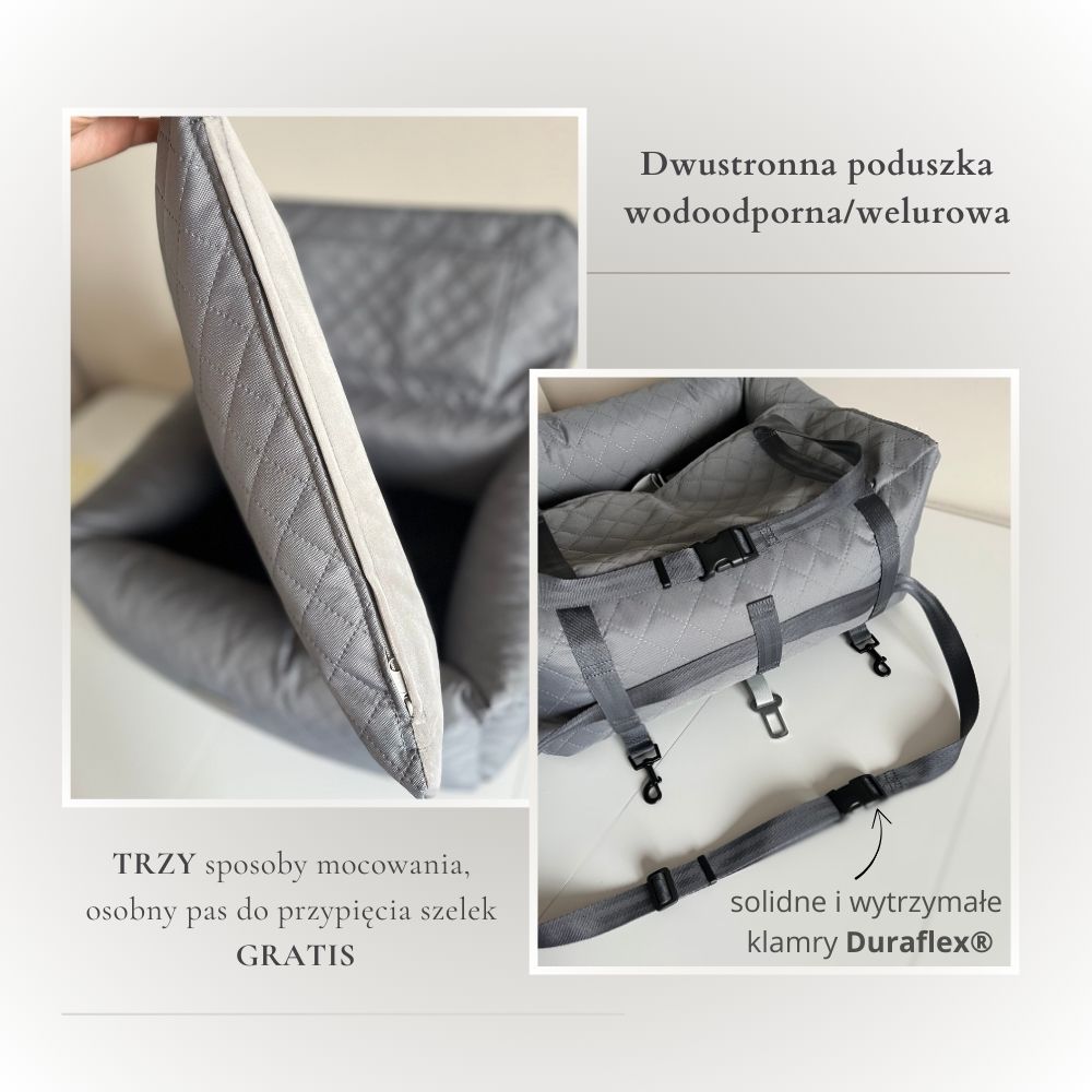 Fotelik wykonany jest z wysokiej jakości wodoodpornej tkaniny z certyfikatem OEKO-TEX, dzięki czemu skutecznie chroni tapicerkę auta przed zabrudzeniami i wilgocią. Wewnątrz znajduje się dwustronna poduszka. Jedna strona to miękki, przyjemny w dotyku welur, idealny na chłodniejsze dni. Druga strona to tkanina wodoodporna, doskonała po spacerach lub w cieplejsze dni. Fotelik posiada kieszeń, która pozwala wygodnie przechowywać smycz, wodę i wiele innych produktów.