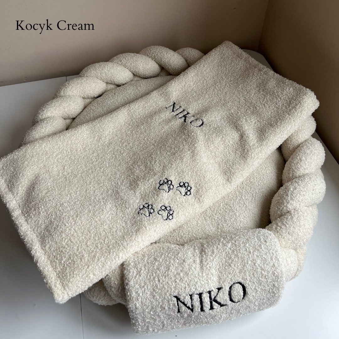 Personalizowana narzuta/kocyk z materiału Boucle to połączenie elegancji i funkcjonalności. Wykonana z tego samego miękkiego i przyjemnego w dotyku materiału co Legowisko Premium Boucle, stanowi idealne uzupełnienie legowiska. Sprawdzi się jako narzuta, dodając ciepła i przytulności, jednocześnie chroniąc powierzchnię przed zabrudzeniami, ale również jako grubszy kocyk, umilając Twojemu pupilowi sen. To nie tylko praktyczny, ale i stylowy dodatek, który wniesie do wnętrza odrobinę luksusu.