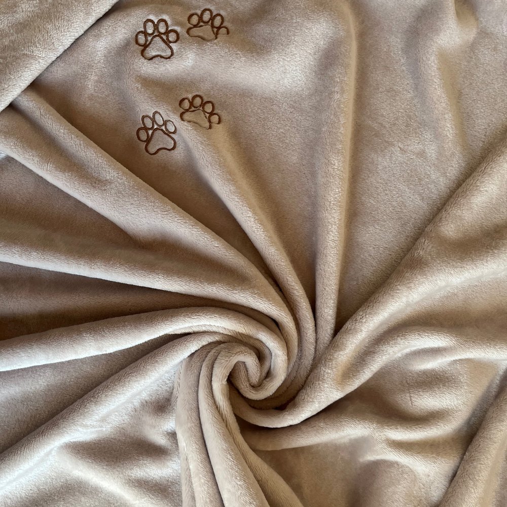 Ciepły i stylowy koc, który możesz spersonalizować według swoich upodobań! W cenę koca wliczony jest haft czterech łapek w dwóch przekątnych rogach lub krótki napis (np. „Kocyk Pańci”, „Kocyk Kochanej Ani”) w jednym rogu oraz cztery łapki w drugim.