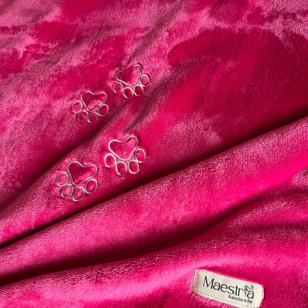 Ciepły i stylowy koc, który możesz spersonalizować według swoich upodobań! W cenę koca wliczony jest haft czterech łapek w dwóch przekątnych rogach lub krótki napis (np. „Kocyk Pańci”, „Kocyk Kochanej Ani”) w jednym rogu oraz cztery łapki w drugim.