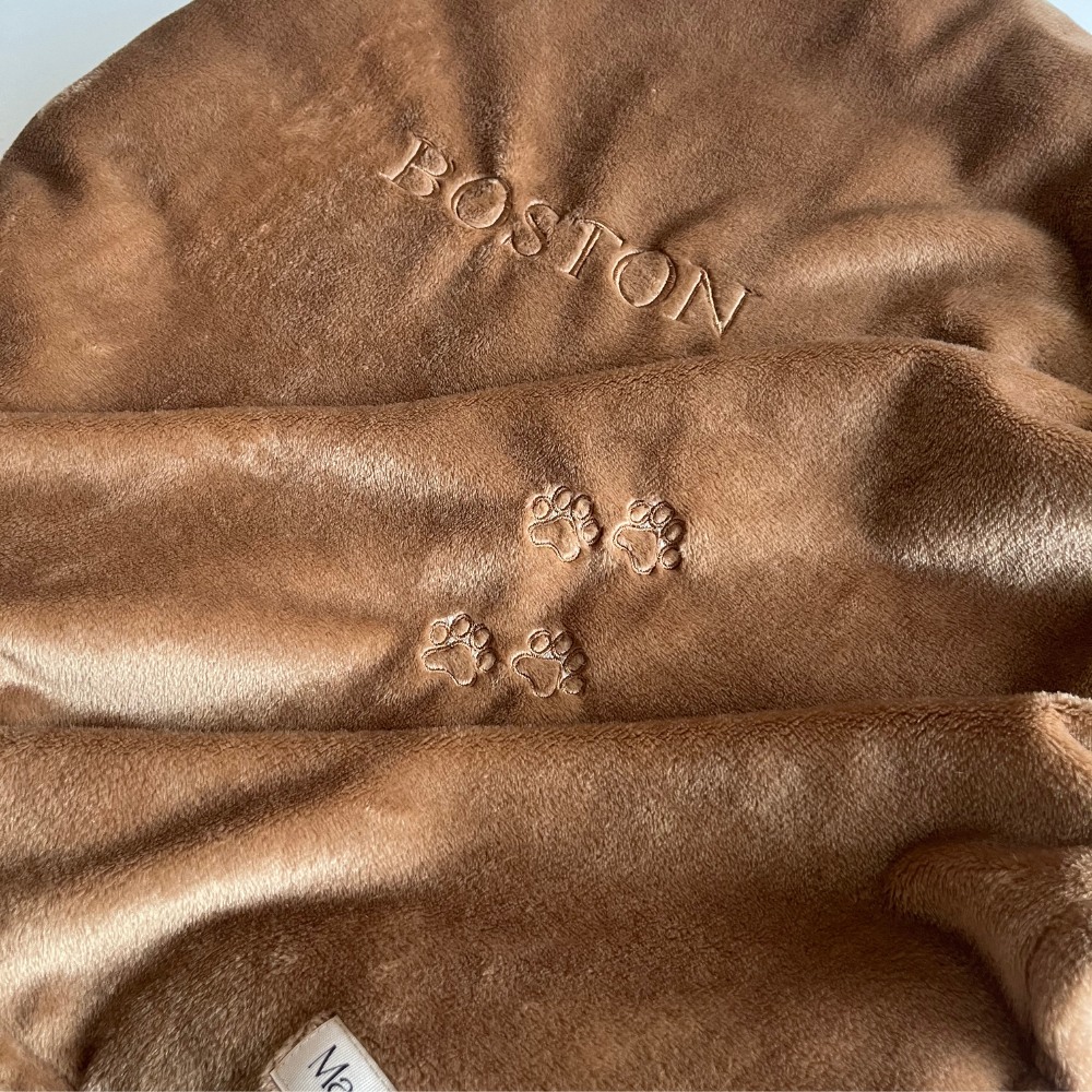Imię pupila haftowane jest na środku od górnej krawędzi kocyka.