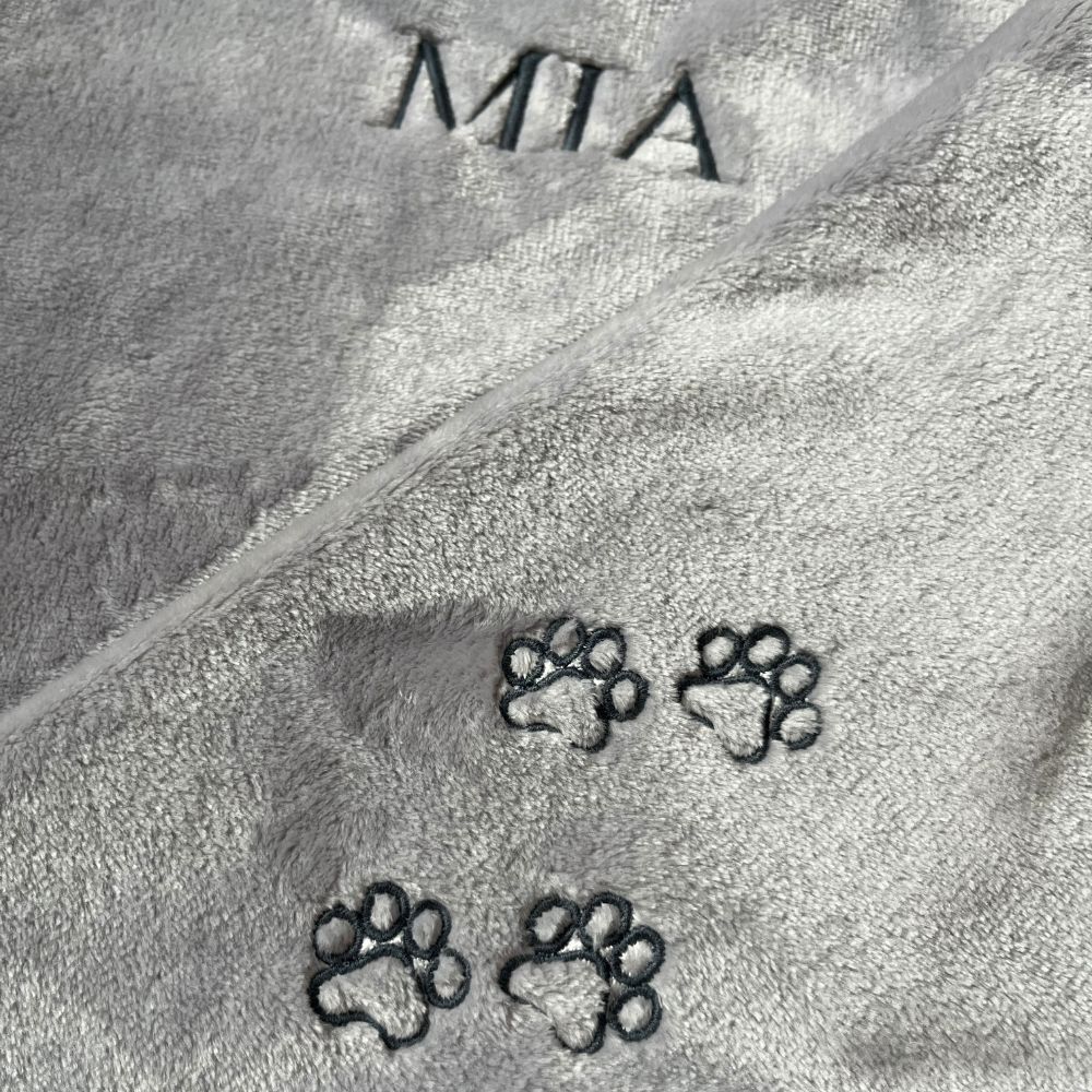 Każdy kocyk jest personalizowany w formie wyhaftowania imienia pupila z dużych liter.